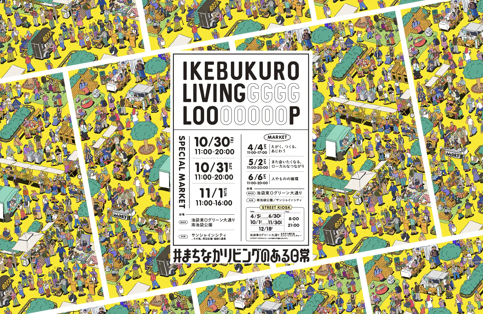 2017年から池袋東口グリーン大通りをメイン会場として開催してきた「池袋リビングループ」。訪れた人たちが、まるで自分の家のリビングのように居心地良さそうにくつろいだり、自然と食事や会話を楽しんでいる風景が生まれました。